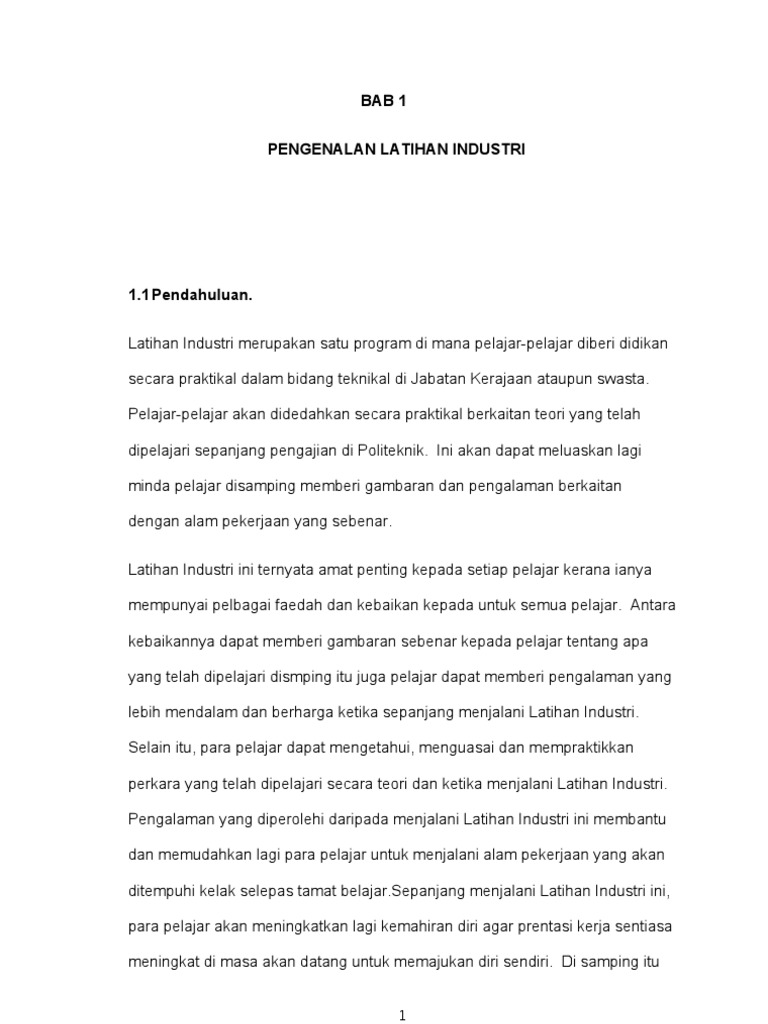 Pelajar akan ditempatkan di firma atau organisasi tertentu selama satu semester bagi mendedahkan mereka. Pengenalan latihan industri dan latar belakang organisasi 1.1 pengenalan latihan industri 1.1.1 pendahuluan 1 1.1.2 objektif latihan industri 1 1.1.3 objektif laporan latihan industri 2 1.1.4 kepentingan latihan industri 3 1.2. Ia adalah bertujuan untuk menilai. Apabila tamat latihan industri yang dijalankan disebuah firma tersebut itu, maka setiap pelajar diharuskan membuat atau menyediakan laporan lengkap dan mengikut piawaian yang telah ditetapkan oleh pihak politeknik. Latihan industri merupakan satu komponen utama dalam kurikulum pembelajaran politeknik kementerian pengajian terdapat tiga objektif utama laporan.