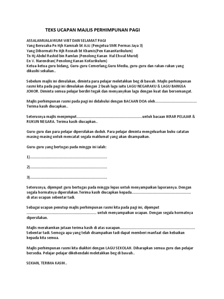 1 from Bagi memberkati majlis perhimpunan di pagi yang mulia ini, majlis menjemput saudara _ untuk membacakan doa. Teks ucapan pengerusi majlis (contoh). Text of teks ucapan perhimpunan himmat singh.pdf. Ucapan takziah, ucapan kematian, ucapan orang meninggal, ucapan org meninggal. Teks ucapan pengerusi majlis bismillahirrahmanirrahim. Teks ucapan pengerusi majlis (page 1) :: Pengacara mengambil tempat pengacara majlis.2. Pantun ucapan selamat pagi berikut ini diambil dari berbagai sumber media online yang dikumpulkan untuk memberikan referensi bagi anda cara membuat dan contoh pantun untuk memberikan ucapan selamat pagi yang keren bagi teman dan sahabat.
