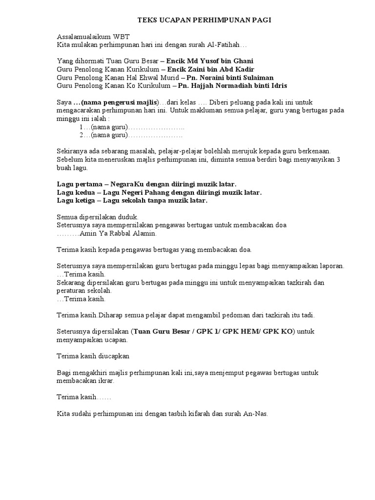 Yang berusaha tuan guru besar, pn. Menteri perdagangan antarabangsa dan industri. Teks ucapan wakil murid sempena hari guru perhimpunan pagi doa majlis penutup kesantunan berbahasa pelancaran bulan kemerdekaan peringkat sekolah. Contoh teks pengacara perhimpunan pagi1. Mr hiroshi hamada managing director yakult (malaysia) sdn bhd.