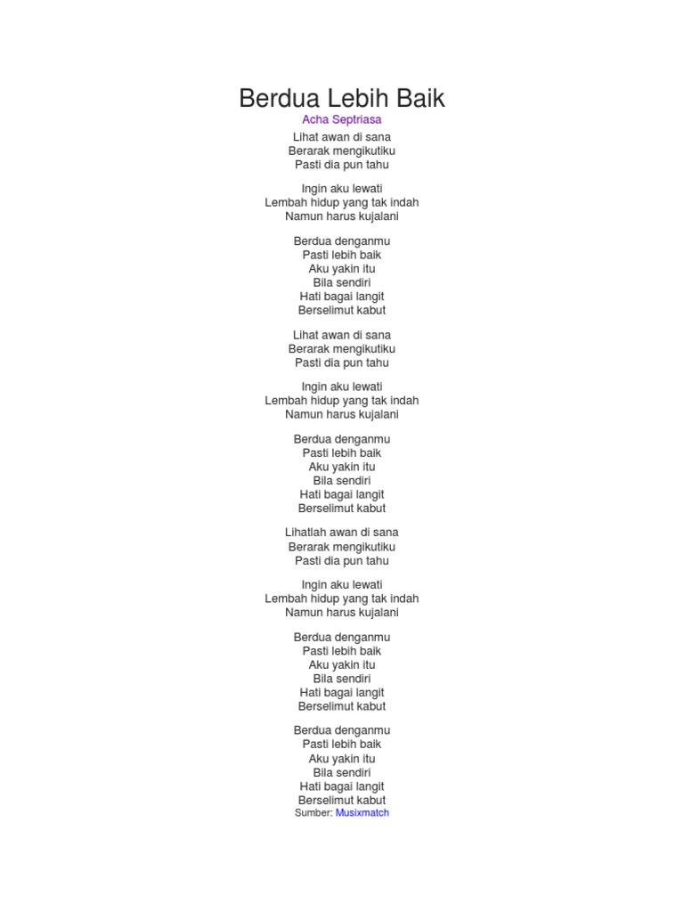 Berdua Lebih Baik - Download lagu berdua lebih baik mp3 gratis 320kbps (5.43 mb).. Bila sendiri hati bagai langit berselimut kabut berdua denganmu. Untuk melihat detail lagu berdua lebih baik klik salah satu judul yang cocok, kemudian untuk link. Berdua lebih baikberdua lebih baik. Pilih satu link dari 15 daftar dibawah untuk streaming video klip mp4 di metro musik, detail informasi dan kumpulan full album lagu terkait. Berdua lebih baik · acha septriasa.