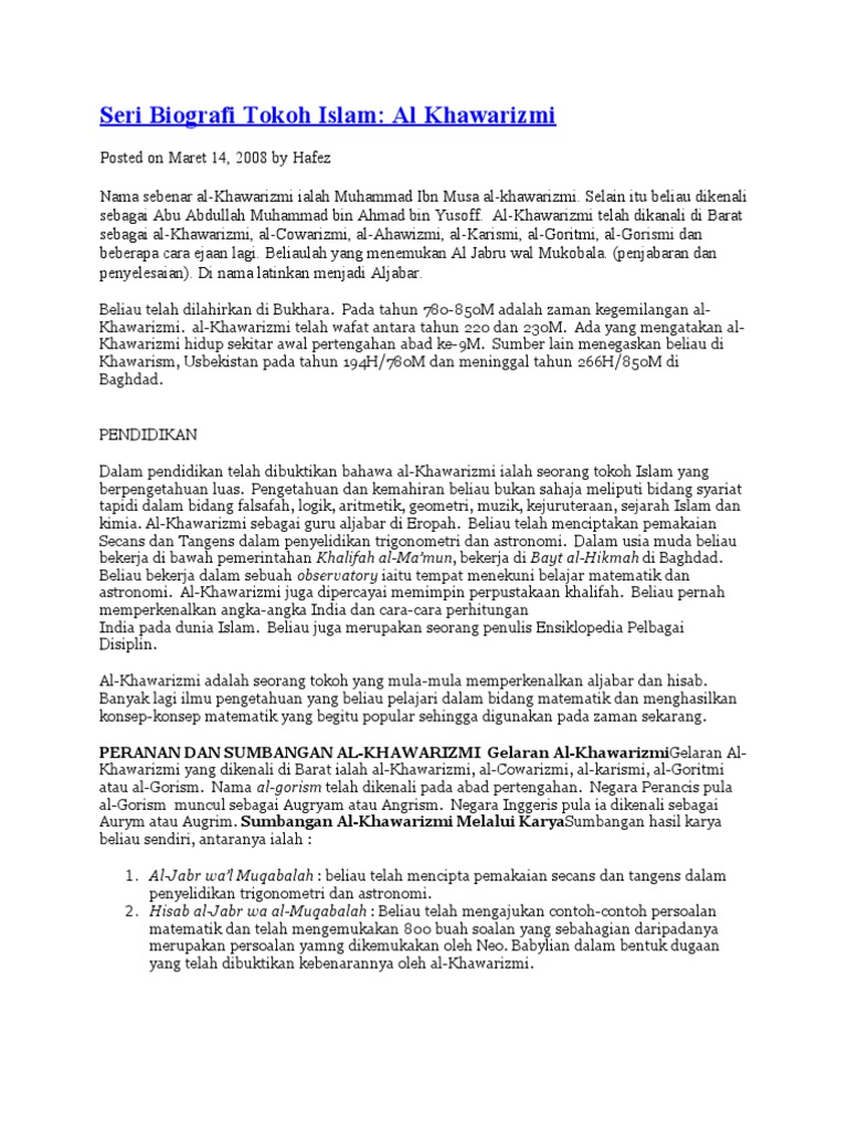 Berikut ini pembahasan tentang para tokoh tokoh islam yang berperan dalam pertumbuhan ilmu tokoh muslim dalam bidang ilmu fikih, yang terkenal dengan sebutan empat imam mazhab, yaitu pada masa pemerintahan dinasti bani abbasiyah telah terjadi perkembangan yang sangat menarik. Sumbangan islam dalam bidang astronomi. Sumbangan tersebut belum pernah dilakukan secara menyeluruh. Bidang matematik yang akan diperincikan mengikut subbidang iaitu aritmetik, aljabar. Beliau lahir di sebuah tempat bernama kath iaitu sebahagian daripada daerah.