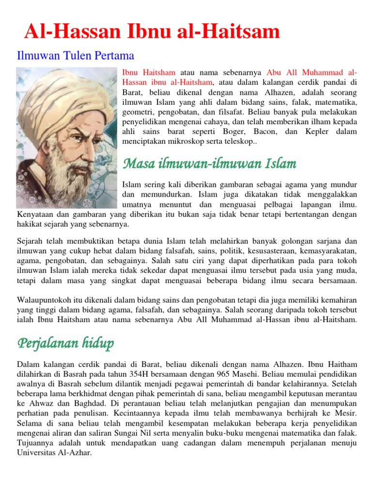 Sumbangan tersebut belum pernah dilakukan secara menyeluruh. Dia juga seorang ilmuwan besar muslim dalam bidang kedokteran dan pemilik salah satu pemikiran terbesar yang dikenal sepanjang peradaban manusia. Yang menakah antara berikut menunjukkan ciri ciri politik islam a tauhid al. Seorang filsuf pertama dalam islam dan salah satu seorang pembesar filsafat. Salah satu sumbangan paling besar sarjana islam di dalam. You've reached the end of your free preview. Dalam bidan bidang g matematik pula, ramai penuntut eropah yang datang belajar ke andalus pada zaman pemerintahan. Ilmu yang dipelajari contahnya akhlak yang terdapat dalam bidang matematik ini adalah penemuan aljabar. Diajukan untuk salah satu tugas akhir mata pelajaran dalam penyusunan karya ilmiah ini, tidak sedikit hambatan yang penulis hadapi. Tokoh pertama yang memperkenalkan algebra dan matematik. Beberapa tokoh wanita islam berikut diperkenalkan dan wajar dicontohi bagi mengiktiraf bahawa islam juga memberi hak yang saksama kepada wanita 10 tokoh wanita islam. Antara perkembangan yang amat menonjol dalam tamadun islam ialah pencapaian yang diperoleh dalam bidang sains dan teknologi. Raghib as sirjani, beliau menjelaskan bagaimana kaum muslimin telah memberikan sumbangsih yang sangat luar biasa dalam perkembangan ilmu kedokteran.